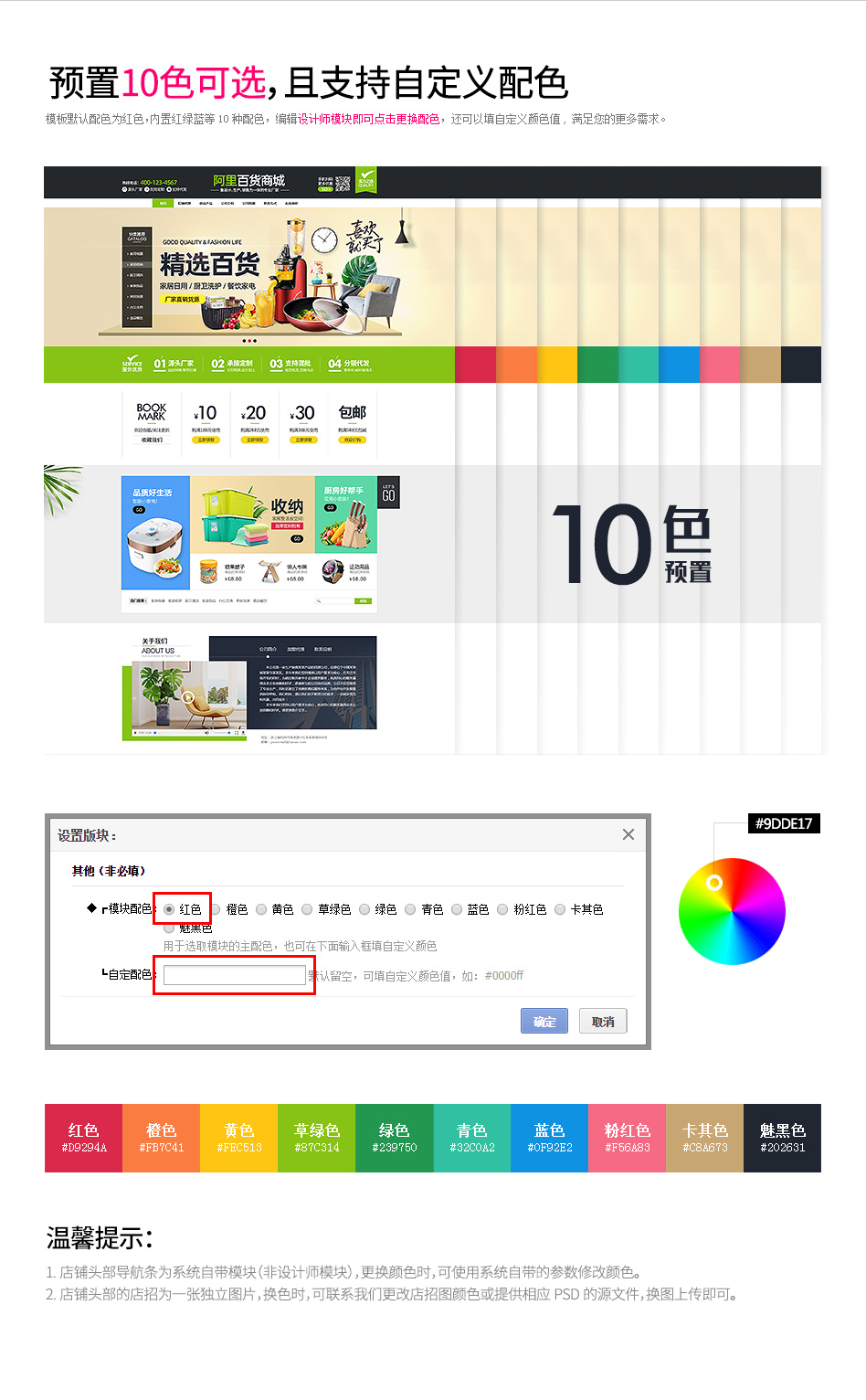 | 其他说明 | 1. 模板仅限购买帐号对应的PC旺铺使用,不可转到其他帐号或多个PC旺铺同时使用。 2. 用户购买付费模板后,设计师须在3个工作日内(节假日顺延)主动联系客户并提供上述服务。 3. 模板已是成品,模板的色调、装饰元素、排版、图片规格等设计风格均不接受修改或定制。如需定制请前往服务市场,另行订购相应服务。 4. 模板售出后不接受退换。 |
