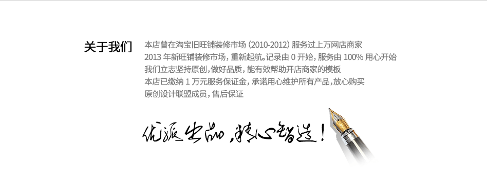 | 使用指导 | 用户购买模板后,负责指导用户如何安装及使用模板,并对用户编辑过程中遇到的操作问题予以解答,不负责PC旺铺其他操作问题; | |||