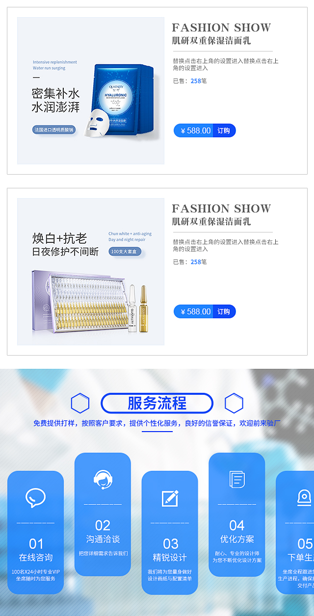 产品图修改 如版块中含自定义产品图,则设计师须为用户修改自定义产品图。用户须按要求提供所需产品原图,由设计师制作成符合规格的图片,并为用户替换或指导用户进行替换。一次性服务,恕不反复修改;